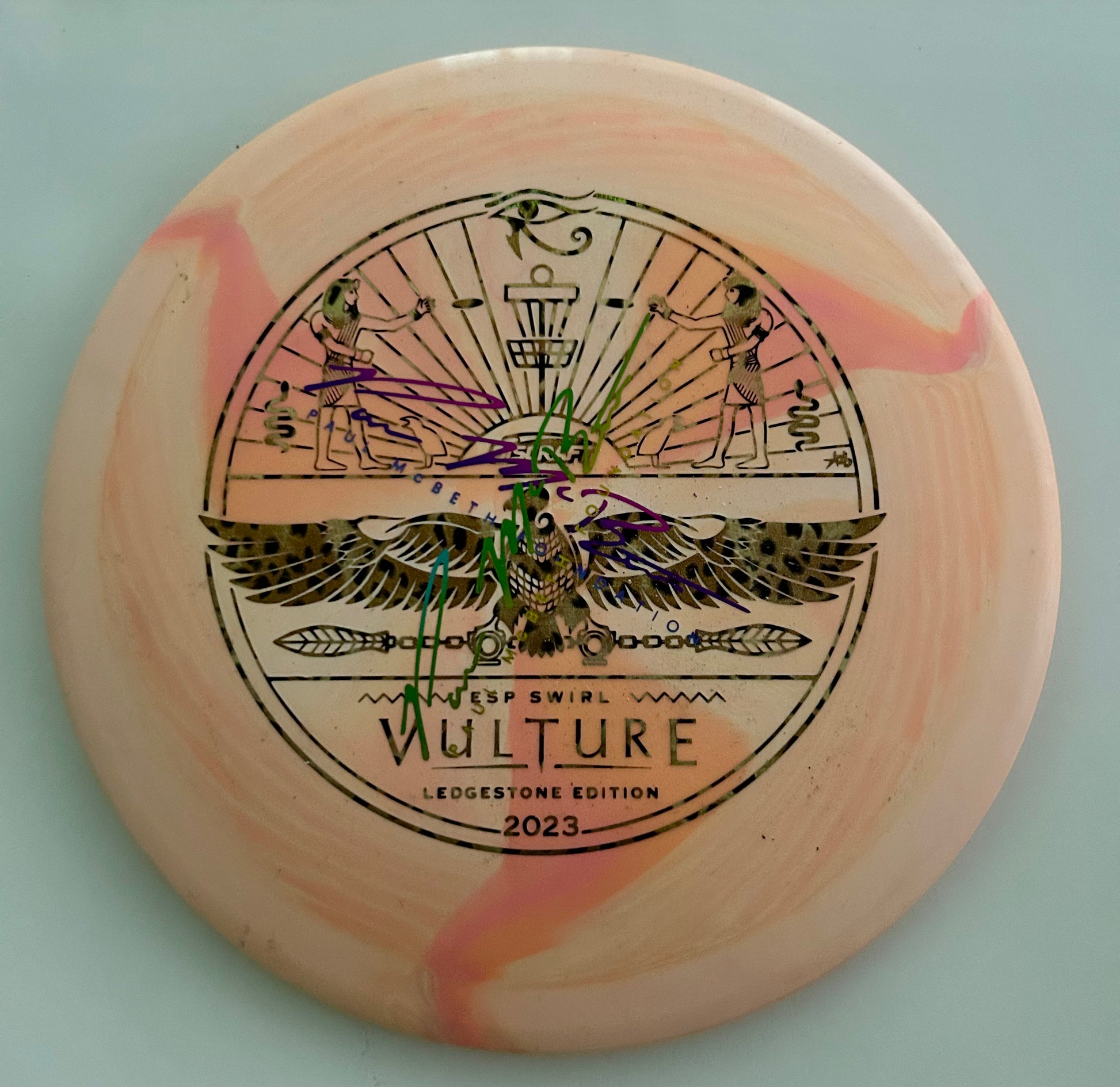 This run is a 2023 Ledgestone Edition ESP Swirl Vulture featuring the Paul McBeth Foundation overstamp, with bold Egyptian-inspired artwork that makes it as display-worthy as it is bag-worthy. ESP Swirl plastic means durability, grip, and stunning color blends unique to each disc.